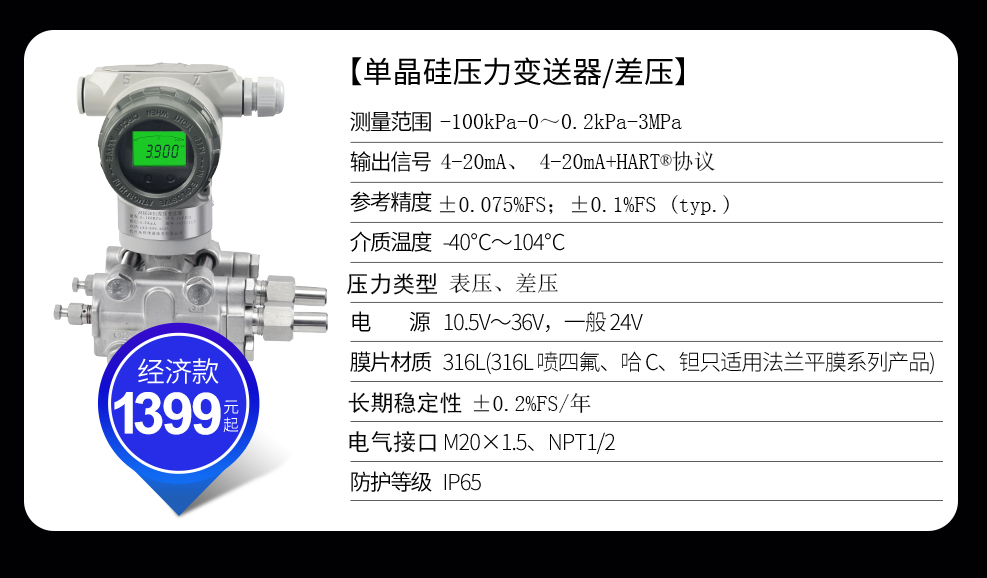 差壓安裝式表壓/絕壓變送器用于測量液體、氣體或蒸汽的液位、密度、壓力,然后將其轉變成4~20mADC HART電流信號輸出。采用先進的高精度單晶硅技術,測量精度高達0.075級,特有的雙過載保護膜設計,單向過壓高達3MPa