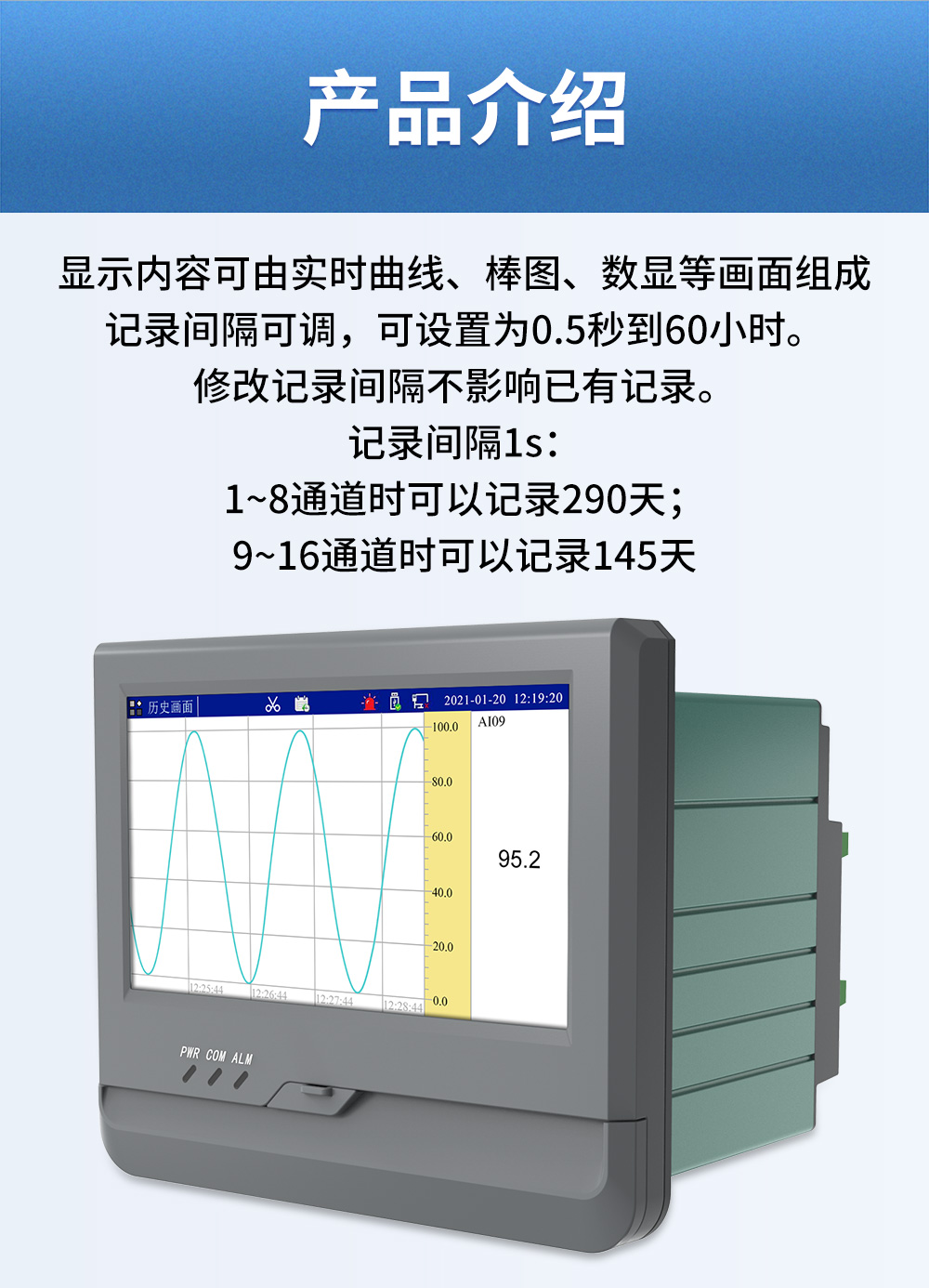 觸摸式彩色無紙記錄儀具有 60 個運算函數、24 路模擬量輸入、3 路 開關量輸入、3 路脈沖量輸入、6 路模擬量變送輸出、16 路開關量輸出, 可實現運算、顯示、記錄、報警、分析統計報表、高速采樣等功能,通 過 RS-232/RS-485 和以太網通訊接口,可實現遠程實時監控、組態管理、 歷史數據讀取等功能,通過 U 盤可實現組態管理、監控畫面管理和歷史 數據管理等功能。 觸摸式彩色無紙記錄儀采用 7 英寸觸摸式液晶屏作為顯示和操作界 面,前方面板防護等級符合 IP65 的要求。